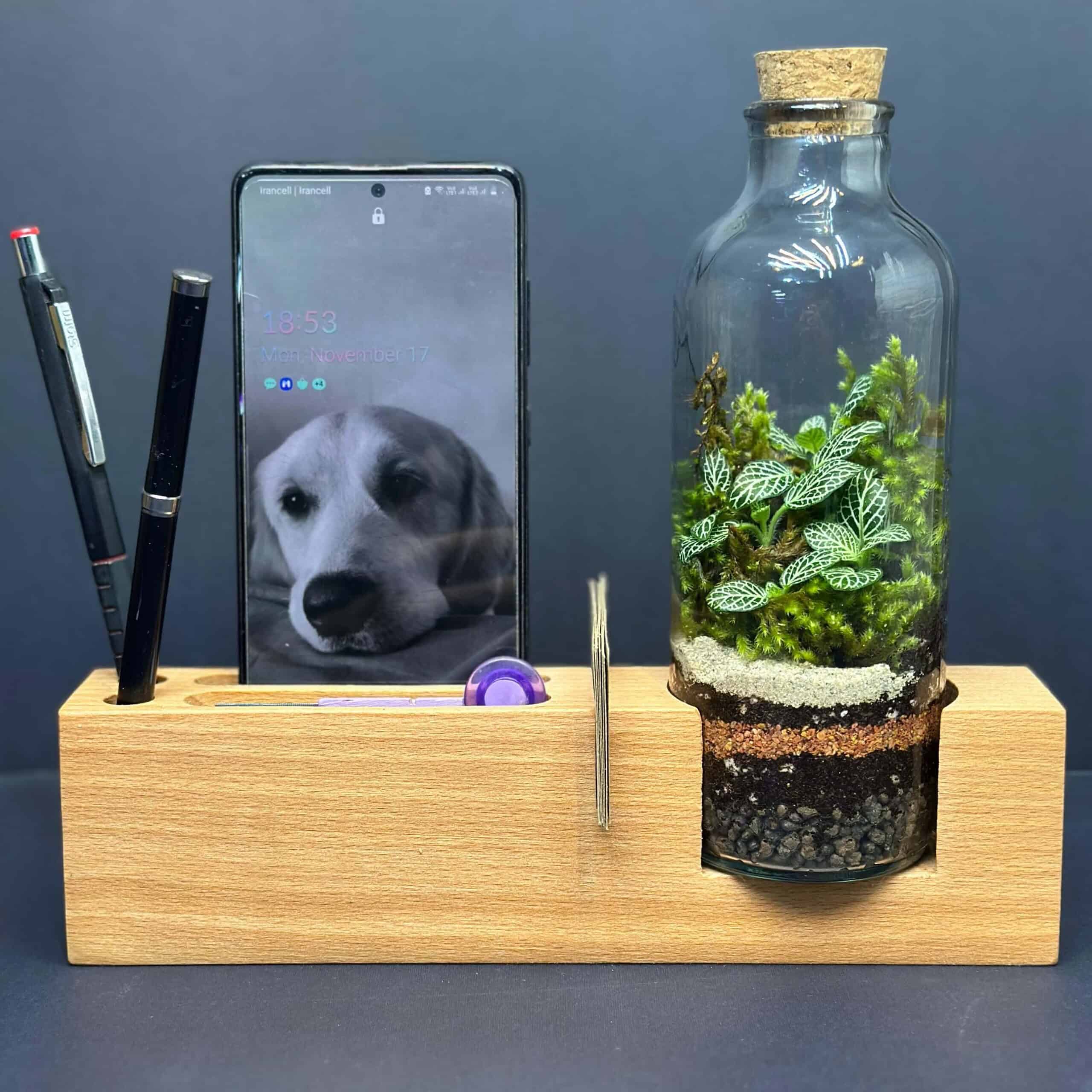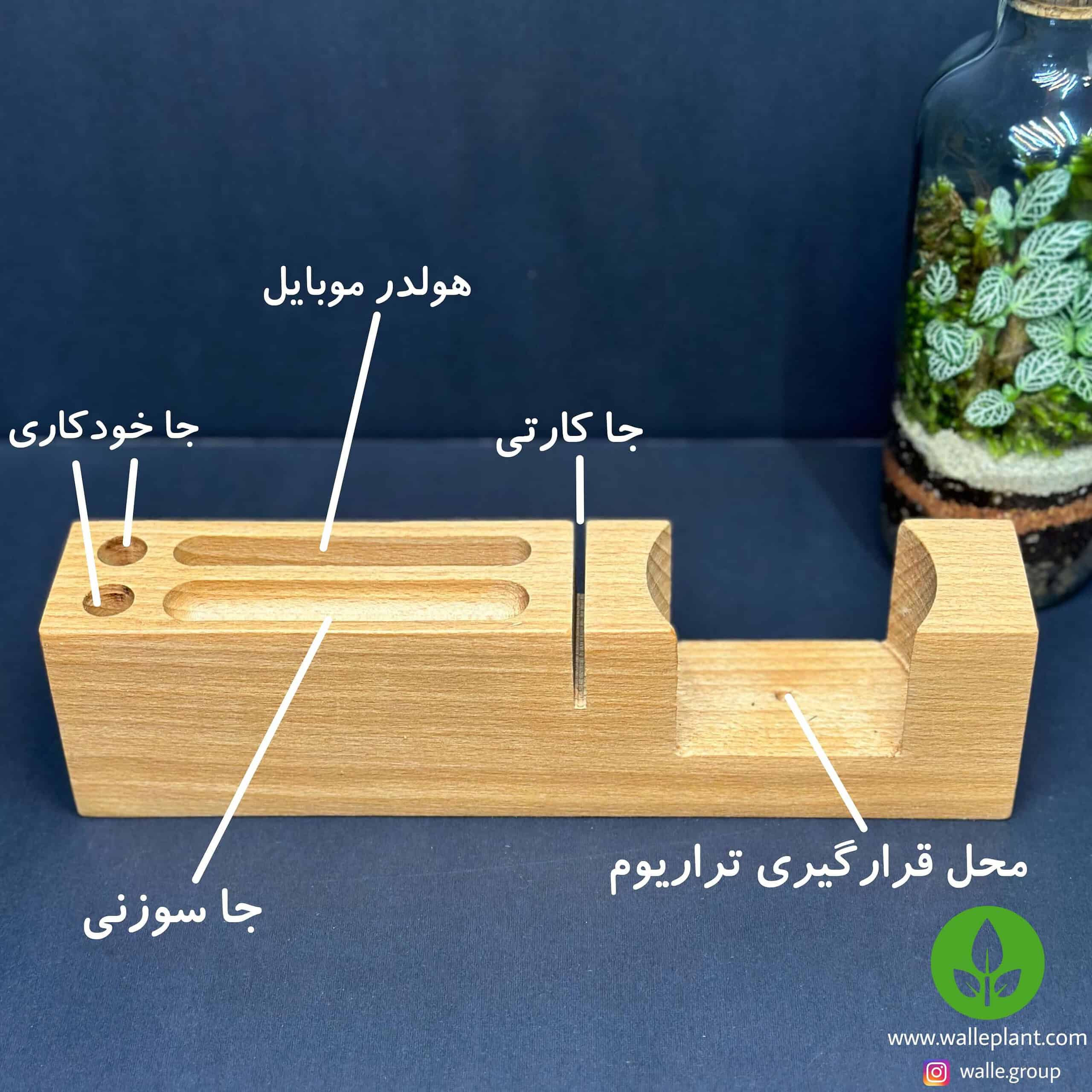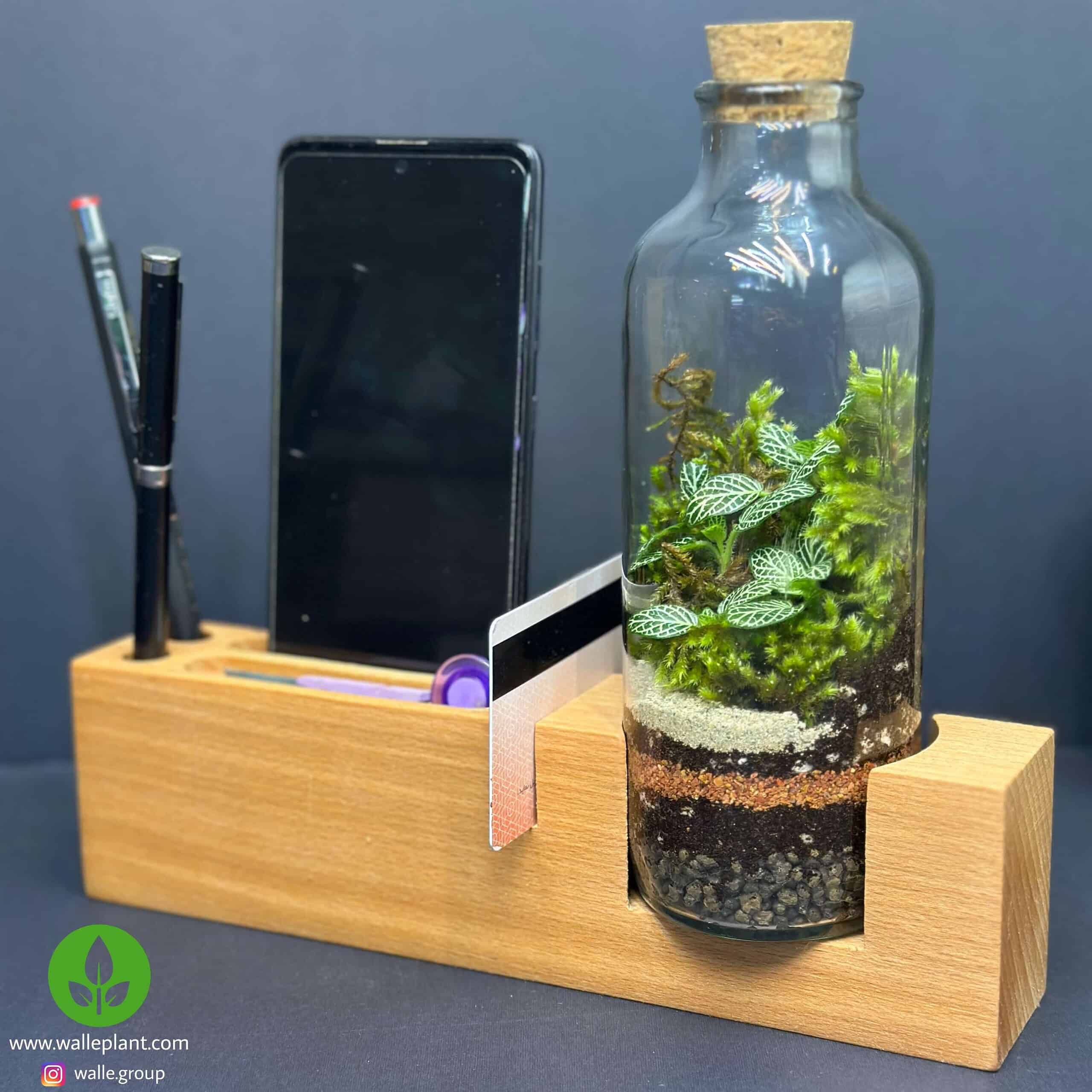 خودکار، موبایل، سوزن، سنجاق و لوازم کوچک را منظم نگه دارید. از طرفی وجود یک تراریوم طبیعی در پایه چوبی